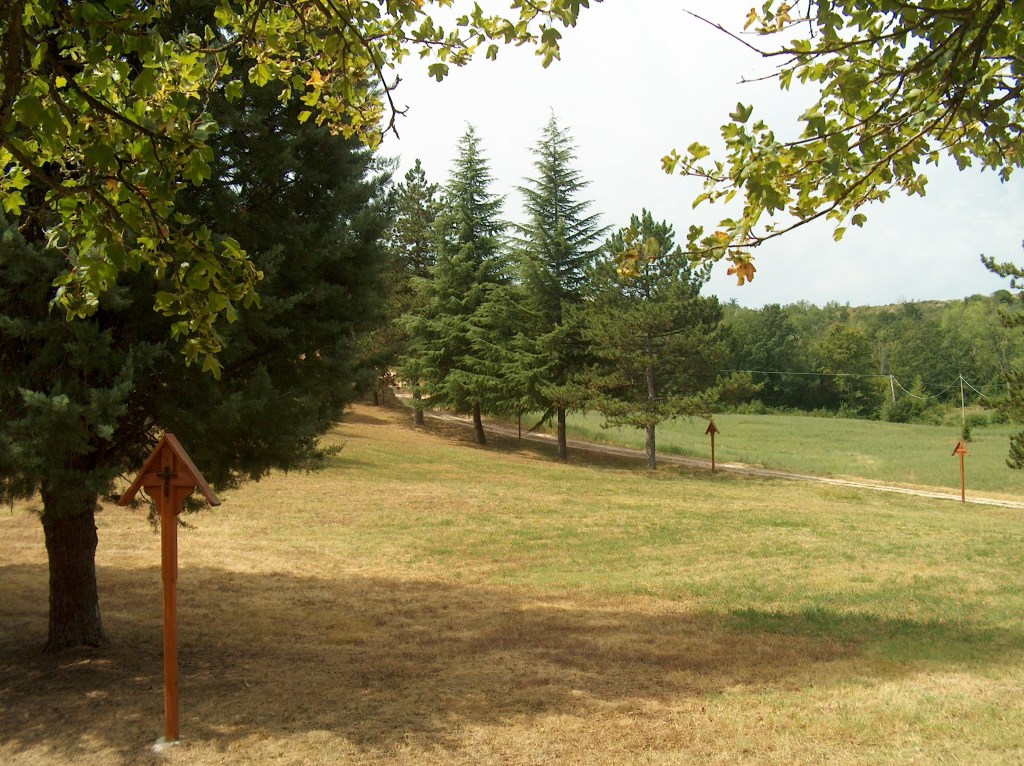 E’ un triangolo di prato nei cui tre lati sono fissati i pali in legno che rappresentano le quattordici stazioni della Via Crucis, proseguono le stazioni delle Sante Piaghe, poi si passa sotto ad un arco e ci sono le due stazioni della Via della Gloria. Le preghiere furono dettate dalla Santa Vergine. E’ una preghiera faticosa, ci si inginocchia ad ogni stazione; la preghiera viene cantata. C’è tutto un rituale che mi è stato ben descritto da Orsolina Michelini ed è stato pubblicato nel mio secondo libro di Testimonianze su Scascoli.