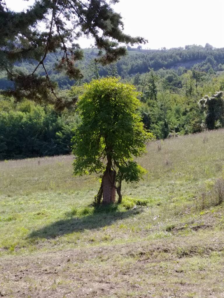 Ecco, poco discosto dalla Grande Croce, quasi di fronte, ad una distanza di neanche dieci metri, c’è questo pilastrino in mattoni con questo cespuglio che in estate si riempie di bellissimi fiori rossi.