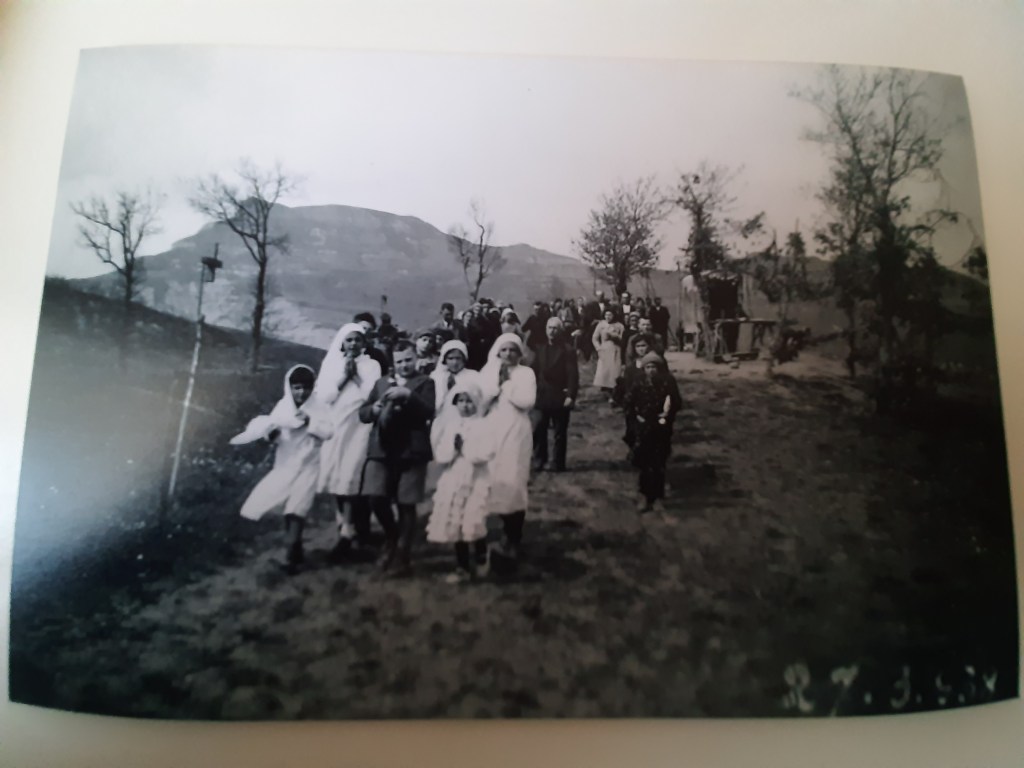 Tornai alla domenica in quel luogo e vidi una manina che aveva stretto uno spargis pieno d’acqua santa, la Madonna apparve, apparve tanto bella, dissi io, ecco lo splendore! Mi pareva di vedere tutta la vita inchinarsi ai piedi di Maria! (è da notare che la Vergine S.S. è apparsa su una vigna) piangendo gridai, ecco la Madonna!, ecco la Madonna! Era una bellezza soprannaturale la vidi e poi la vidi tante volte, non m’aveva mai parlato e mi disse: pregate, pregate, pregate. Una seconda volta tornai sola, sola e mi disse: Allegra, vivi e prega. Arrivò una donna in quel momento non credeva nella santa Apparizione, e la Madonna mi disse “fuggi via, e non star con questa compagnia.” Andando via la Madonna piangeva, e disse: “Oggi non mi posso più far vedere.” Venni a casa accompagnata da un bell’Angelo, io piangevo, e piangevo amaramente ma quell’angelo mi diceva: “Non piangere, figlia ma prega!”