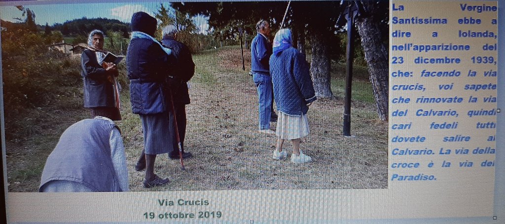 Via Crucis Pubblicato daliacardinale25 Maggio 2021Pubblicato in: Senza categoria Era il 23 dicembre 1939 quando la Vergine Santissima disse queste frasi alla veggente Iolanda. La foto coi fedeli Iole Tognetti, Leonardo e Vincenzo D’Amato, Bruna, la moglie di quest’ultimo, Maria e Carolina è, invece, recente. Condividi: Condividi su X (Si apre in una nuova finestra) X Condividi su Facebook (Si apre in una nuova finestra) Facebook Mi piace Caricamento... Correlati