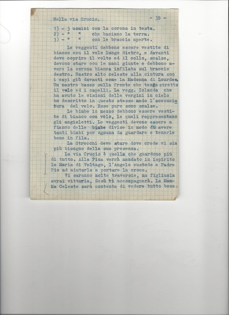 In un dattiloscritto (inedito) di Ada Trebbi-Strocchi (che si occupava di trascrivere e conservare i messaggi), vi sono gli ordini impartiti da Maria SS. alla veggente Pina Coiaccetto per le processioni e la Via Crucis: