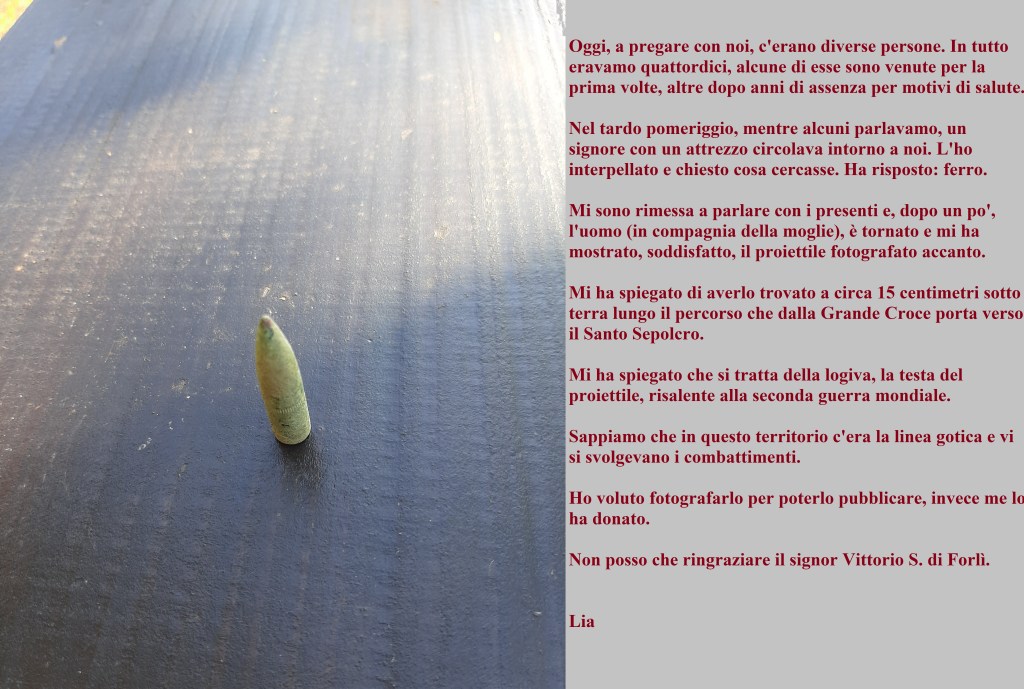 Durante il nostro intenso pomeriggio di preghiera, un uomo, venuto fornito di un attrezzo, ha iniziato ad esplorare il terreno. Gli ho chiesto e mi ha risposto che cercava ferro. Dopo un po’ è tornato con un proiettile..