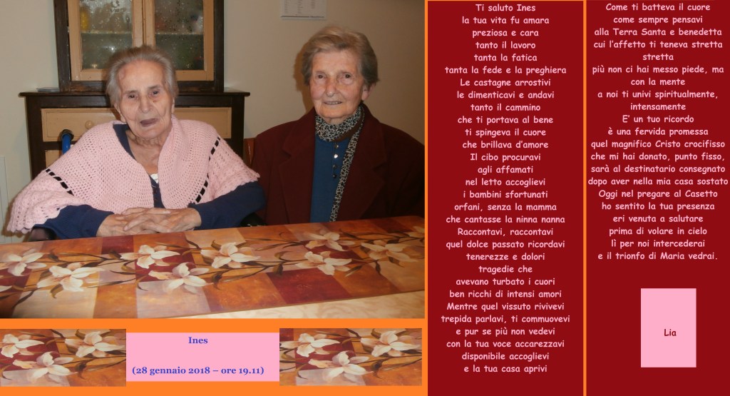 Ines, dolce vecchietta, cieca, su una sedia a rotelle, mi ricevette per due volte nella sua casa. Mi fece ricca testimonianza di quel passato, sempre presente nella sua mente, innamorata della Terra Santa e Benedetta. Mi donò un bel crocifisso da custodire fino a quando non avrà dimora nel Santuario che sorgerà. Noi ci crediamo fermamente e continuiamo a trovarci in preghiera, insieme per adorare Dio e venerarne la Mamma. Arriverà presto il Trionfo di Maria e i suoi fedeli guarderanno, con grande gioia, dal cielo…