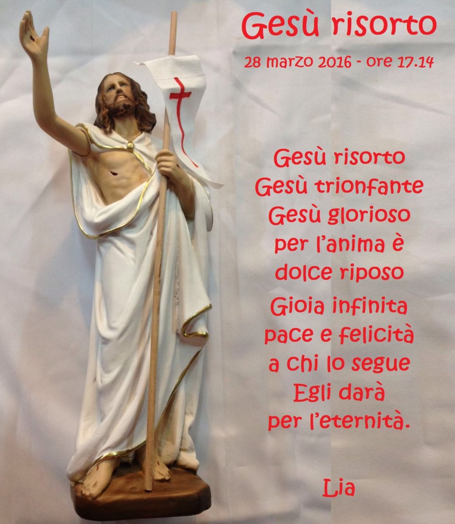 Gesù risorto Pubblicato daliacardinale18 aprile 2022Pubblicato in: Senza categoria Condividi: Condividi su X (Si apre in una nuova finestra) X Condividi su Facebook (Si apre in una nuova finestra) Facebook Mi piace Caricamento... Correlati