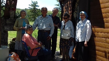 Davanti al casottino che contiene la statua della Madonna col Bambino: da sinistra: Maria Calzoni, Vincenzo e Leonardo D’Amato, Carolina Vecchi, Iole Tognetti; seduta: Bruna, moglie di Vincenzo