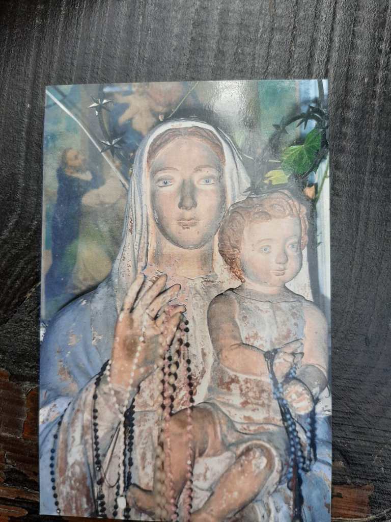 La nuvoletta era color oro e la sua forma era come quando una persona si arrotola dentro ad un lenzuolo, pian piano si aprì e apparve un velo bianco, che copriva il capo fino ai piedi. Dentro al velo si vedevano le gambe e le braccia, sulla testa un cerchio dorato. Questa immagine apparve come quando una persona cammina contro vento; la gamba destra era diritta e la sinistra un po’ piegata; le braccia aperte, il braccio destro un po’ in su e il sinistro dava verso il basso. Camminava verso sud e il velo era steso verso il nord. Aveva una fascia ai fianchi di colore azzurrino, anch’essa sventolava insieme al velo. È stata una visione bellissima! La donna bionda ha fatto una foto. Questo gruppetto di persone che abbiamo visto eravamo: io, mia moglie, mia sorella Anna e Sandra Tibaldi. Gli altri non hanno visto niente perché si erano allontanati dal luogo dove avevamo pregato. Maria Santissima, di tanto in tanto, ci fa di questi bei regali e noi La ringraziamo.