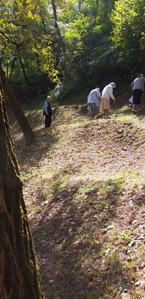 Si andava giù lentamente, ad ogni tappa si fermavano e, in ginocchio, continuavano la preghiera. Ad ogni sosta: Santo Sepolcro, Ascensione, Assunzione ecc., preghiere in ginocchio e Iole cambiava i fiori, lavava i vasi, spazzava, riordinava. Aveva sempre le mani bagnate e in inverno c’erano delle temperature molto basse, da congelarsi le mani. Poi, molto lentamente, si tornava su dal boschetto, sgranando altre coroncine. Anche nell’ultimo tratto, in salita dal boschetto, ripetevano la coroncina: Viva Gesù, vogliamo Gesù, che regni sopra di noi, finita quella attaccavano con l’altra: Maria, regina delle vittorie, aiutaci a vincere ogni battaglia. La salita veniva affrontata lentamente, è molto ripida e la vivevano con un senso di combattimento, sfida contro il nemico. Arrivati davanti alla statua della Madonna, finalmente iniziavano la recita dei tre rosari meditati, sempre in ginocchio. Quando non ne potevano più cercavano di spostare lentamente il corpo indolenzito. Duravano ore ed ore in ginocchio; stavano in piedi solo per il canto. Mai ha usato tanto le ginocchia Massimo, come in quegli anni, in quel posto. Preghiera continua, senza soste. Mai è piovuto quando sono andati lì, mai hanno avuto disagi per andarci, né sulla via di ritorno; hanno patito forse un po’ di umidità.