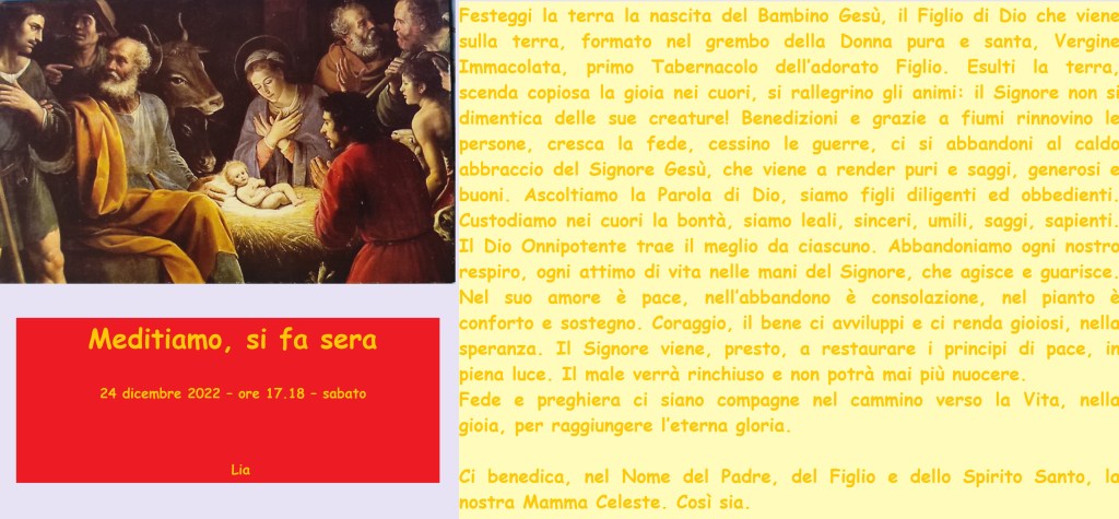 Meditiamo, si fa sera Pubblicato daliacardinale24 dicembre 2022Pubblicato in: Senza categoria Condividi: Condividi su X (Si apre in una nuova finestra) X Condividi su Facebook (Si apre in una nuova finestra) Facebook Mi piace Caricamento... Correlati