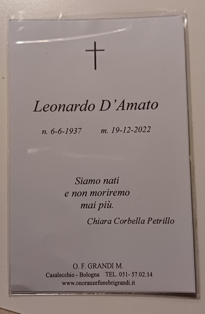 Oggi sono andata al funerale di Iole Tognetti, erano presenti alcuni componenti della famiglia D’Amato, anch’essi colpiti dal lutto, la settimana scorsa, del fratello Leonardo, fedele della Terra Santa e Benedetta di Scascoli. Mi hanno dato il santino, a ricordo.
