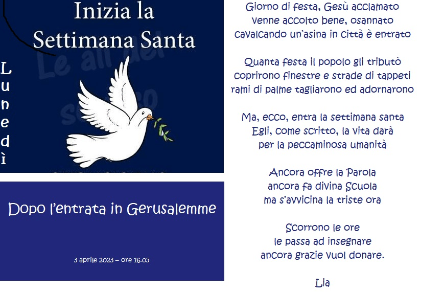 Inizia la Settimana Santa, dedichiamo ad essa le pubblicazioni con alcune mie poesie ed alcuni Inni provenienti dagli scritti sulla Terra Santa e Benedetta di Scascoli.