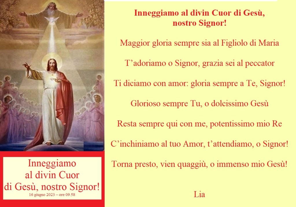 Inneggiamo al divin Cuor di Gesù, nostro Signor! Pubblicato daliacardinale16 giugno 202316 giugno 2023Pubblicato in: Senza categoria Condividi: Condividi su X (Si apre in una nuova finestra) X Condividi su Facebook (Si apre in una nuova finestra) Facebook Mi piace Caricamento... Correlati