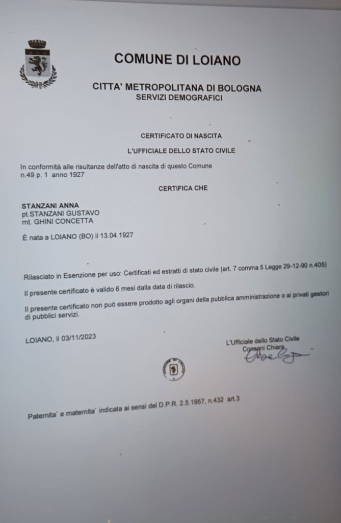 Il certificato di nascita di Anna Stanzani, nata a Loiano