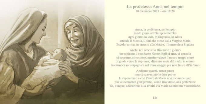 La profetessa Anna nel tempio Pubblicato daliacardinale30 dicembre 2023Pubblicato in: Senza categoria Condividi: Condividi su X (Si apre in una nuova finestra) X Condividi su Facebook (Si apre in una nuova finestra) Facebook Mi piace Caricamento... Correlati