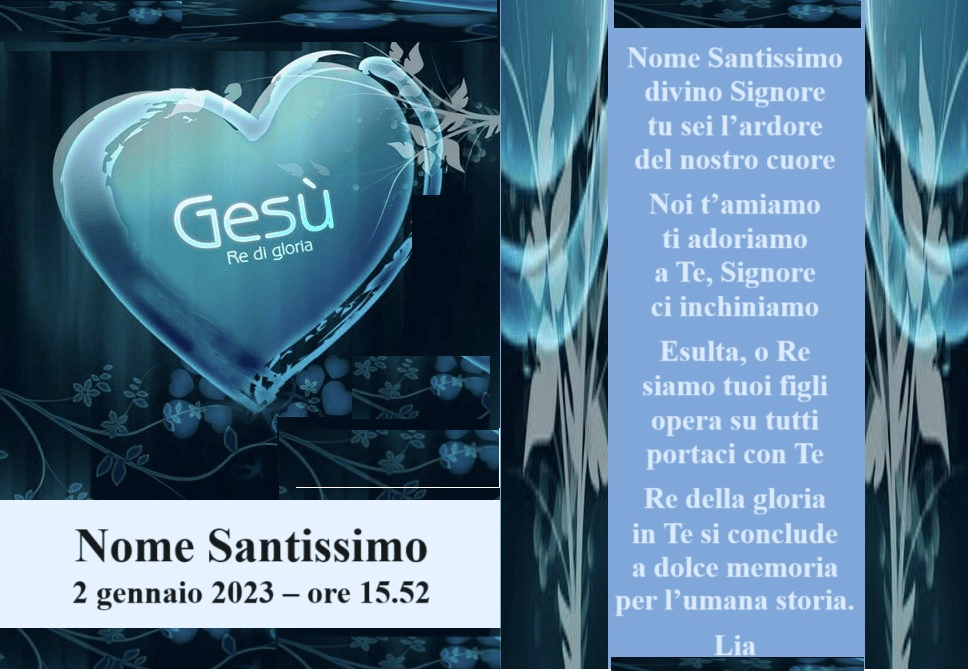 Nome Santissimo, Gesù, Re di Gloria Pubblicato daliacardinale2 gennaio 20242 gennaio 2024Pubblicato in: Senza categoria Condividi: Condividi su X (Si apre in una nuova finestra) X Condividi su Facebook (Si apre in una nuova finestra) Facebook Mi piace Caricamento... Correlati