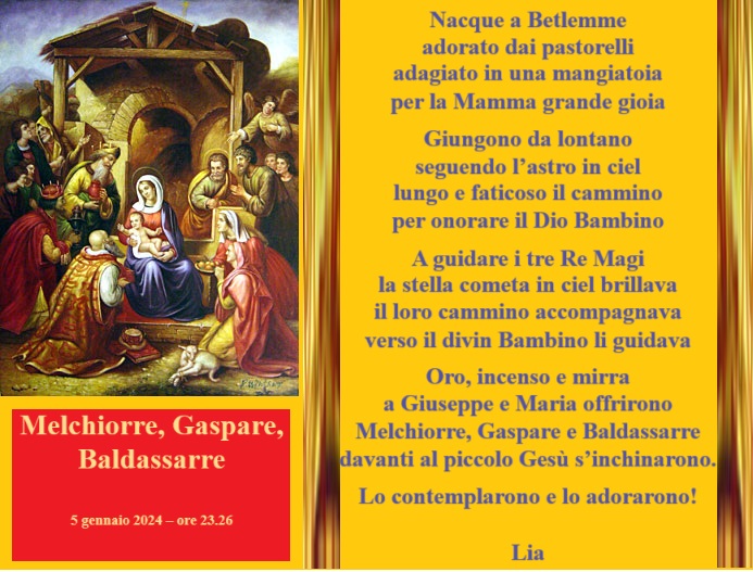 Melchiorre, Gaspare, Baldassarre Pubblicato daliacardinale6 gennaio 2024Pubblicato in: Senza categoria Condividi: Condividi su X (Si apre in una nuova finestra) X Condividi su Facebook (Si apre in una nuova finestra) Facebook Mi piace Caricamento... Correlati