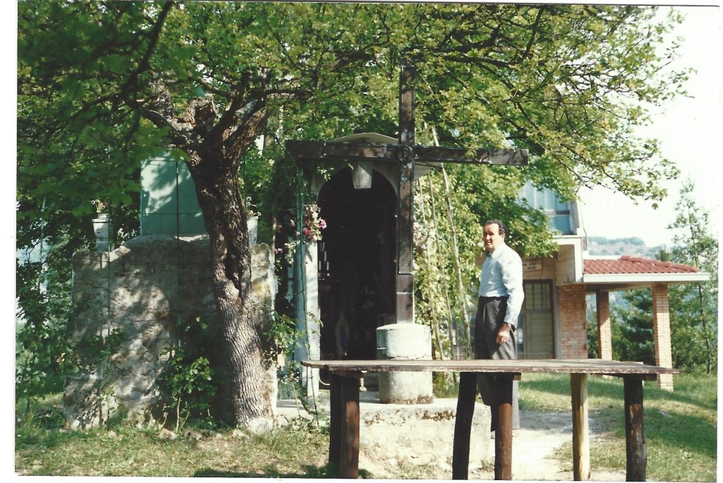 Anno 1989 – Tonino accanto all’Addolorata, vicino al Casetto; notare il tavolo che era diverso, l’albero frondoso e la Cappellina non intonacata nella parte bassa. Non c’era ancora la panca e neanche il Casetto in legno, messo successivamente per proteggere meglio la statua della Beata Vergine del Santo Rosario.