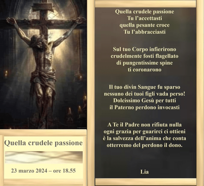 Quella crudele passione Pubblicato daliacardinale24 marzo 2024Pubblicato in: Senza categoria Condividi: Condividi su X (Si apre in una nuova finestra) X Condividi su Facebook (Si apre in una nuova finestra) Facebook Mi piace Caricamento... Correlati