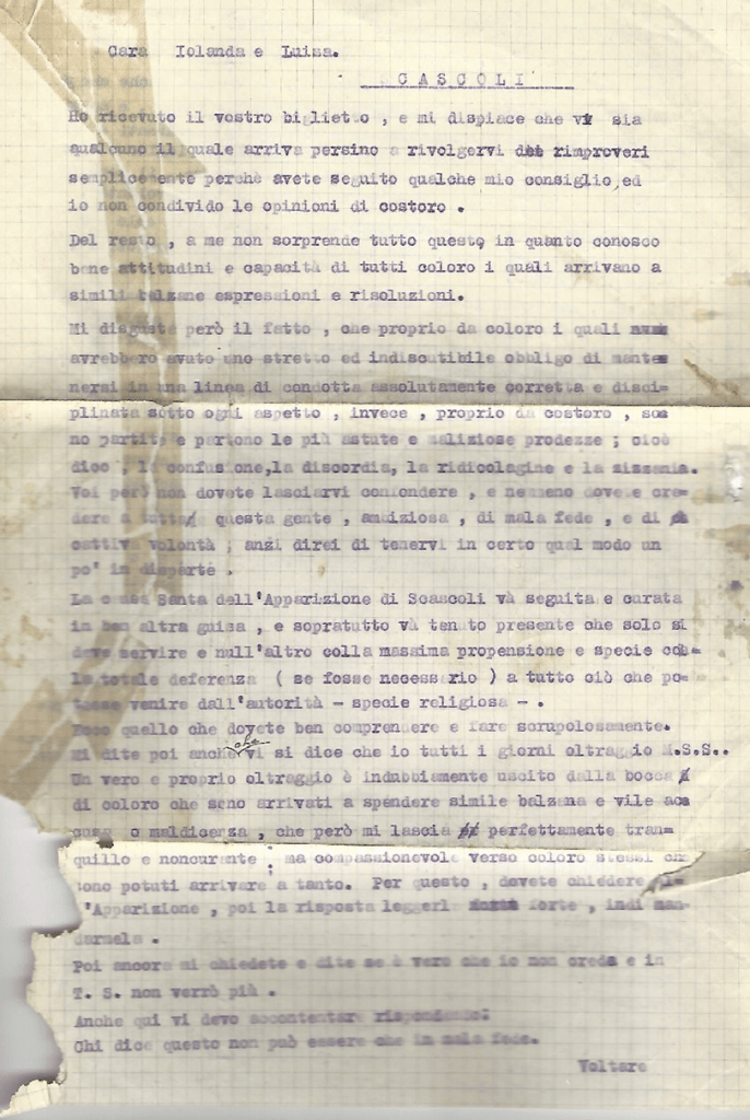 Lettera inviata alle veggenti Iolanda e Luisa Collina dal geometra Amedeo Pirazzoli, costruttore della Cappellina nella Terra Santa e Benedetta di Scascoli.
