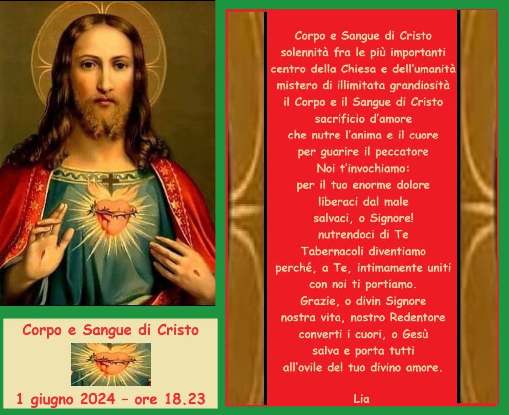 Corpo e Sangue di Cristo Pubblicato daliacardinale1 giugno 2024Pubblicato in: Senza categoria Condividi: Condividi su X (Si apre in una nuova finestra) X Condividi su Facebook (Si apre in una nuova finestra) Facebook Mi piace Caricamento... Correlati