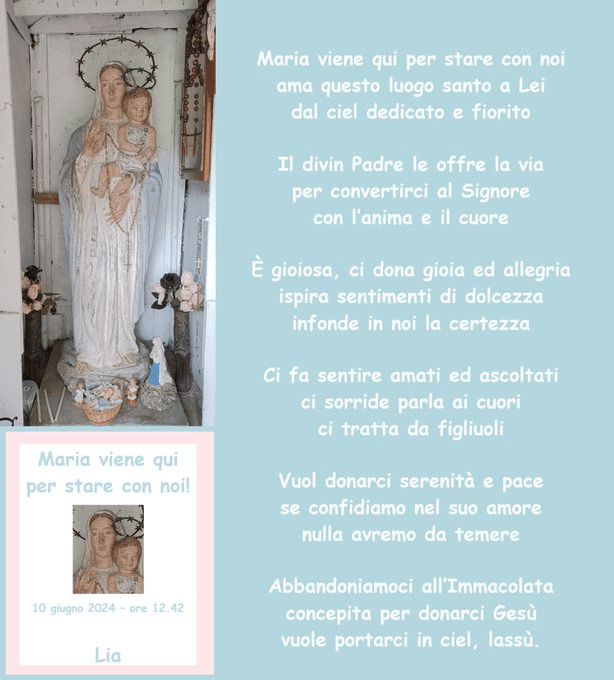 Maria viene qui per stare con noi Pubblicato daliacardinale10 giugno 202410 giugno 2024Pubblicato in: Senza categoria Condividi: Condividi su X (Si apre in una nuova finestra) X Condividi su Facebook (Si apre in una nuova finestra) Facebook Mi piace Caricamento... Correlati
