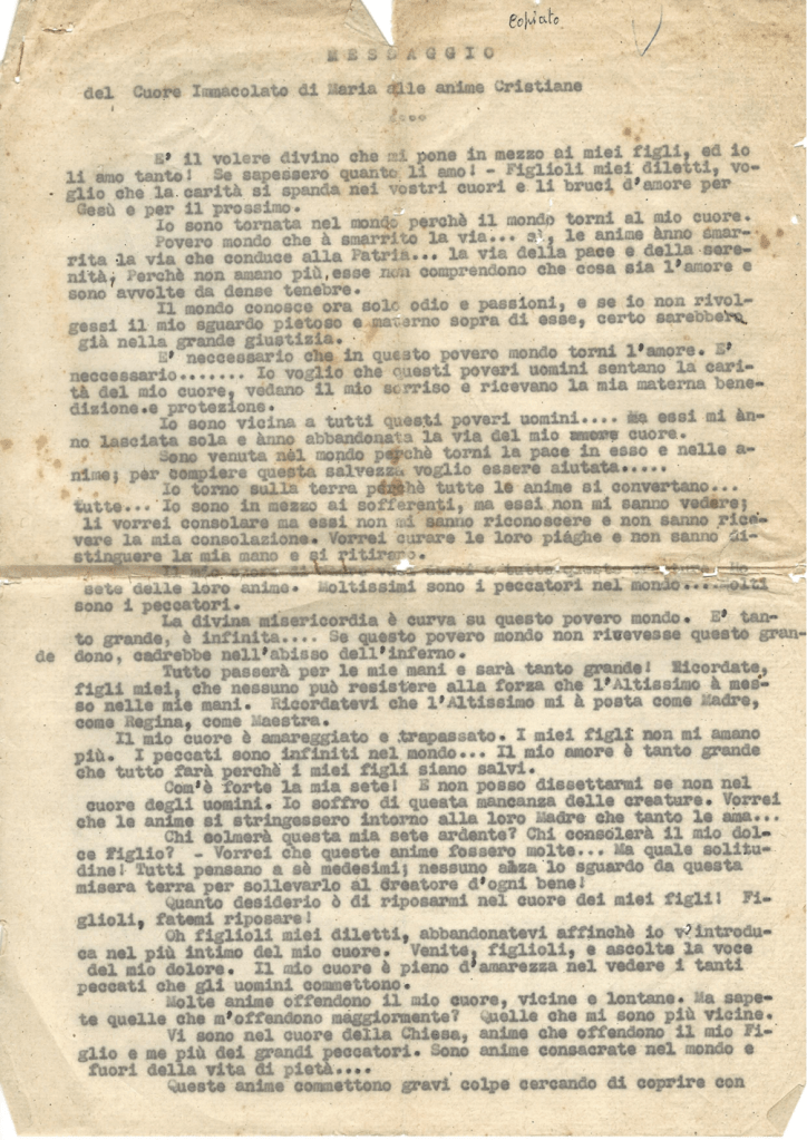 Tra i tanti documenti pervenutici, vi è un dattiloscritto: “Messaggio del Cuore Immacolato di Maria alle anime cristiane”; manca la data e a chi è stato dettato, ma è estremamente attuale.