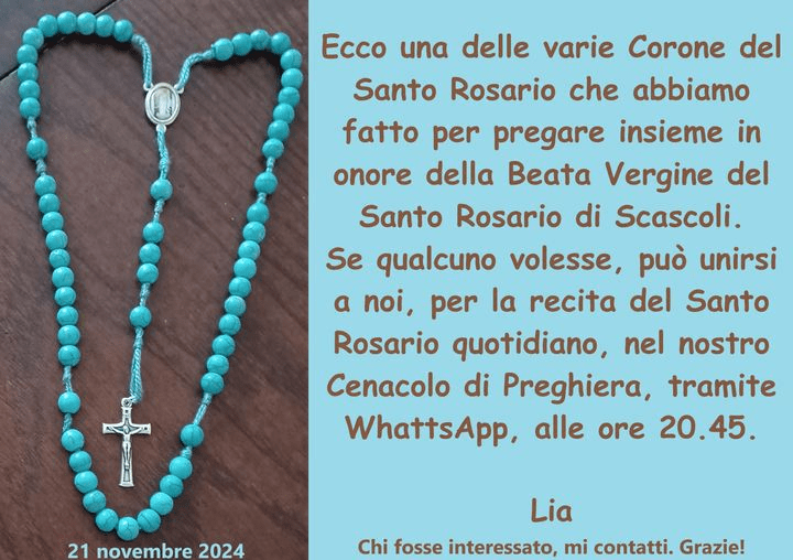 L’occasione mi è propizia per invitare, chi lo desideri, a recitare, in latino, quotidianamente, il Santo Rosario, nel mio Cenacolo di Preghiera, che si riunisce, alle ore 20.45 – tramite WatthsApp.