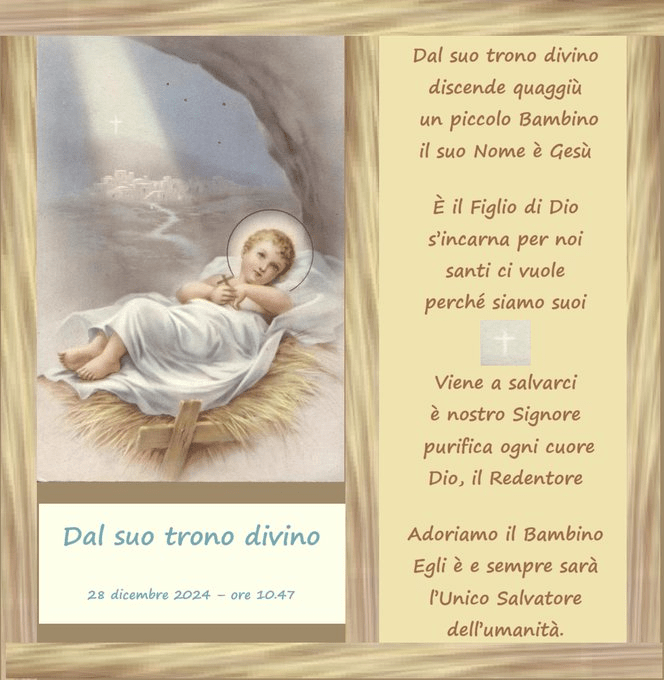 Dal suo trono divino Pubblicato daliacardinale28 dicembre 2024Pubblicato in: Senza categoria Condividi: Condividi su X (Si apre in una nuova finestra) X Condividi su Facebook (Si apre in una nuova finestra) Facebook Mi piace Caricamento... Correlati