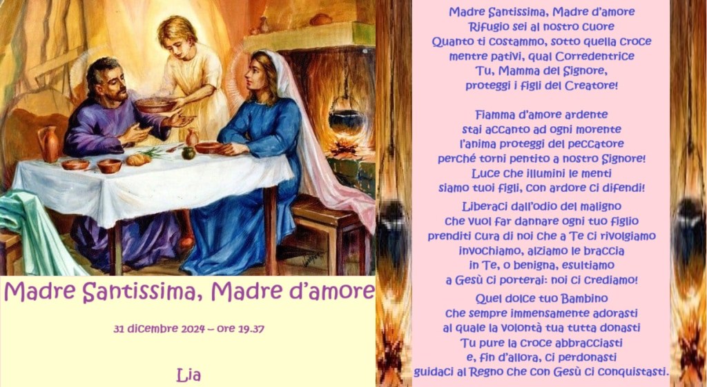 Madre Santissima, Madre d’amore Pubblicato daliacardinale31 dicembre 2024Pubblicato in: Senza categoria Condividi: Condividi su X (Si apre in una nuova finestra) X Condividi su Facebook (Si apre in una nuova finestra) Facebook Mi piace Caricamento... Correlati