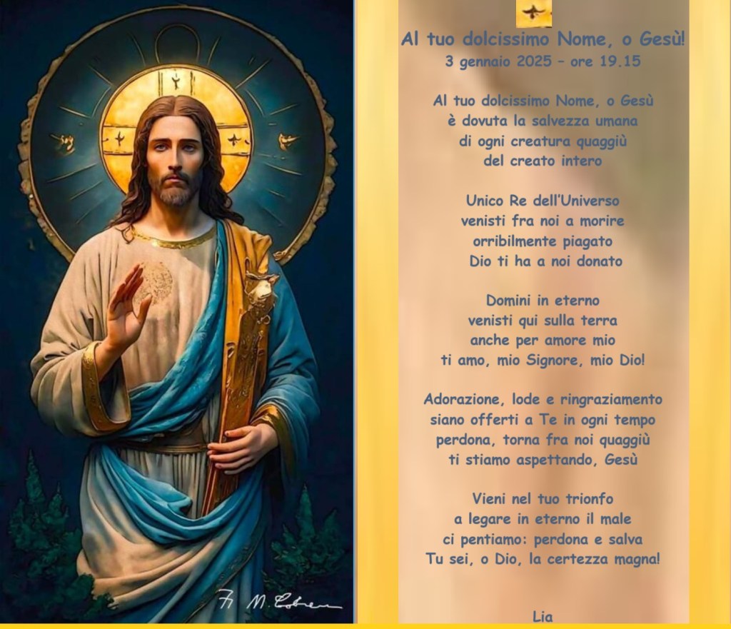 Al tuo dolcissimo Nome, o Gesù! Pubblicato daliacardinale4 gennaio 2025Pubblicato in: Senza categoria Condividi: Condividi su X (Si apre in una nuova finestra) X Condividi su Facebook (Si apre in una nuova finestra) Facebook Mi piace Caricamento... Correlati
