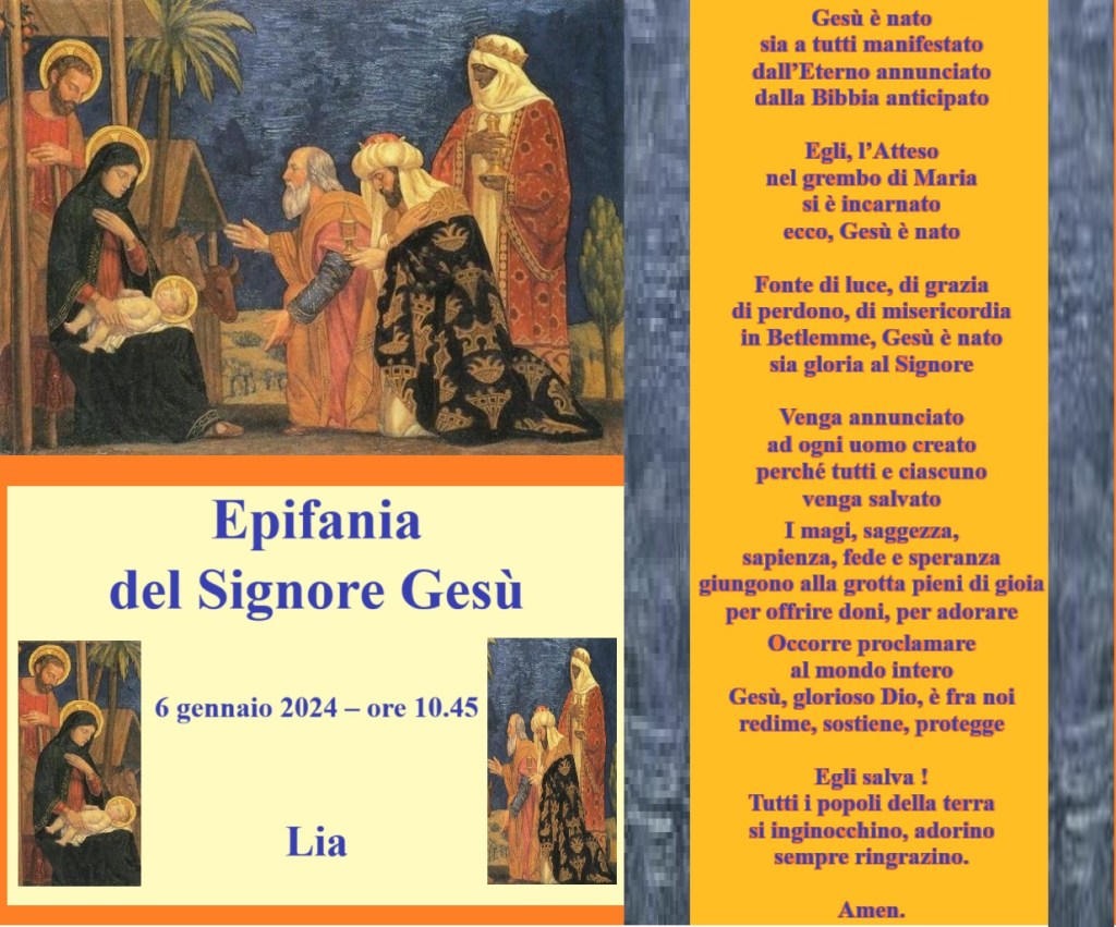Epifania del Signore Gesù Pubblicato daliacardinale6 gennaio 2025Pubblicato in: Senza categoria Condividi: Condividi su X (Si apre in una nuova finestra) X Condividi su Facebook (Si apre in una nuova finestra) Facebook Mi piace Caricamento... Correlati