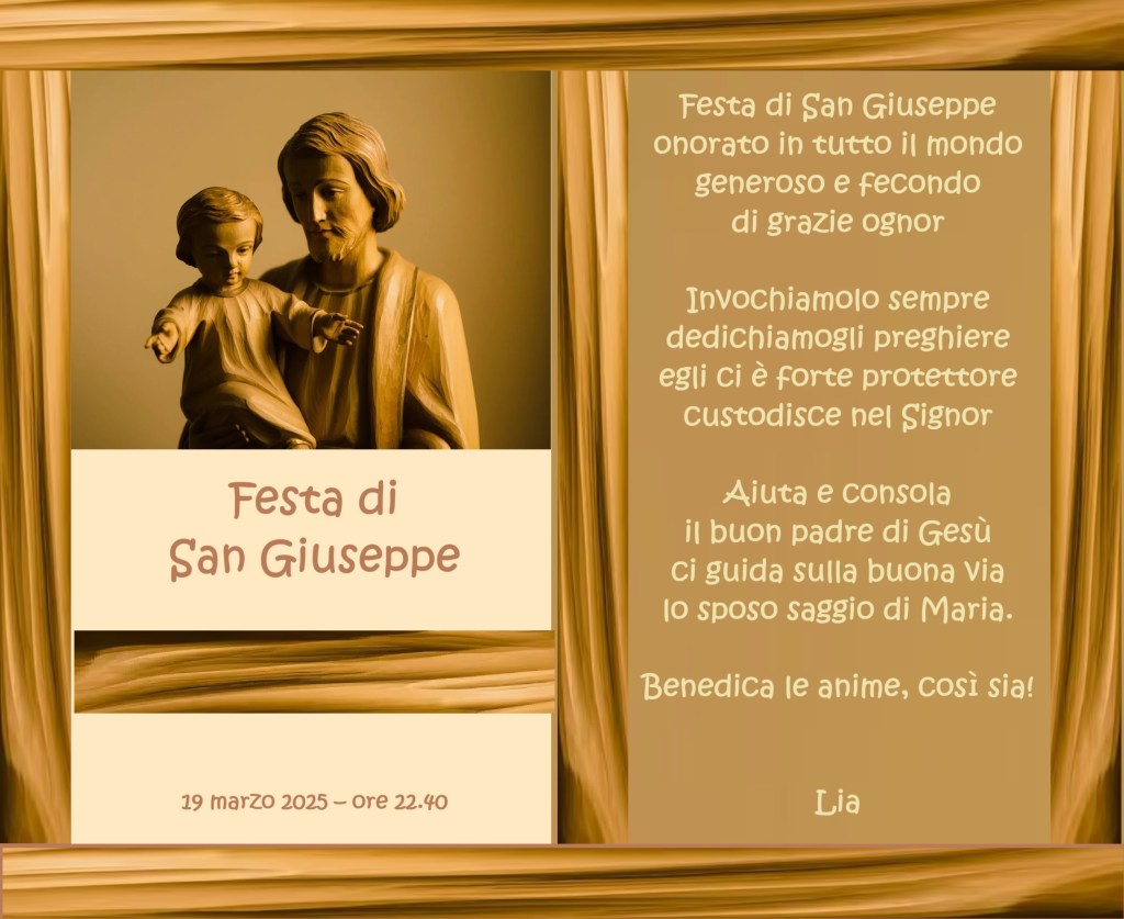 Oggi festa grande in Sicilia in onore di San Giuseppe Pubblicato daliacardinale19 marzo 2025Pubblicato in: Senza categoria Condividi: Condividi su X (Si apre in una nuova finestra) X Condividi su Facebook (Si apre in una nuova finestra) Facebook Mi piace Caricamento... Correlati