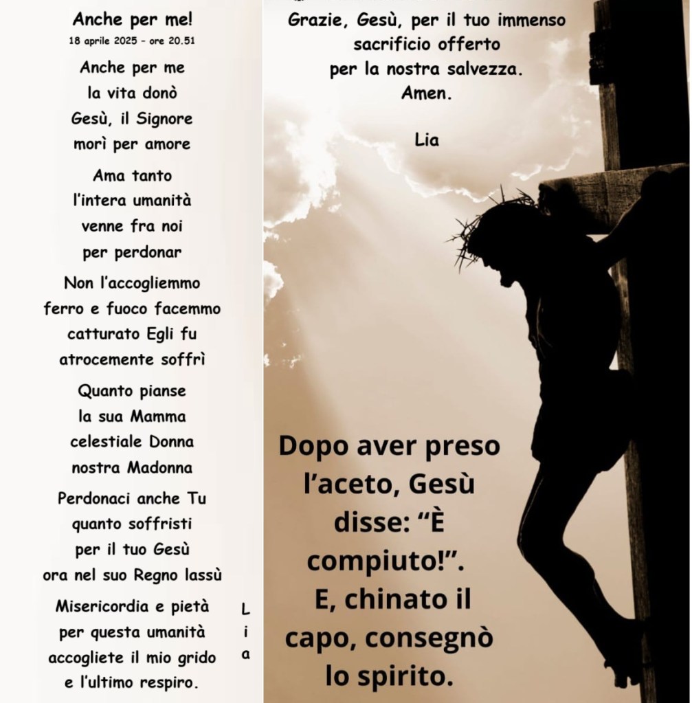 Ciascuno di noi ha un debito infinito col Signore e con la sua tenerissima Mamma. Quanto hanno sofferto e patito per noi. Adoriamo, ringraziamo, invochiamo, sempre!