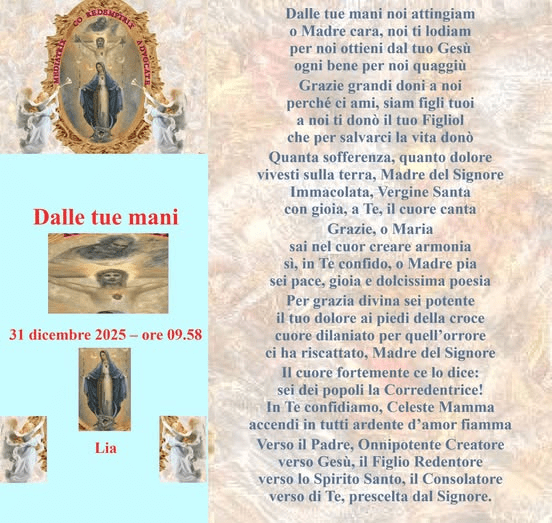 Dalle tue mani Pubblicato daliacardinale31 dicembre 2025Pubblicato in: Senza categoria Condividi: Condividi su X (Si apre in una nuova finestra) X Condividi su Facebook (Si apre in una nuova finestra) Facebook Mi piace Caricamento... Correlati