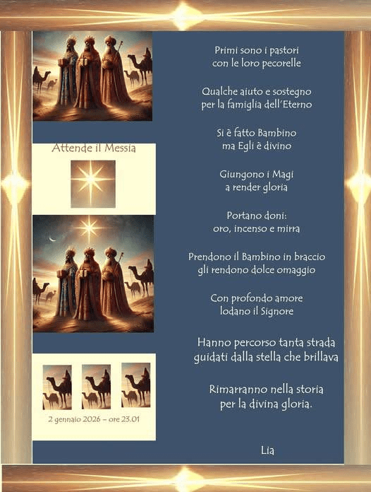 Attende il Messia Pubblicato daliacardinale3 gennaio 2026Pubblicato in: Senza categoria Condividi: Condividi su X (Si apre in una nuova finestra) X Condividi su Facebook (Si apre in una nuova finestra) Facebook Mi piace Caricamento... Correlati