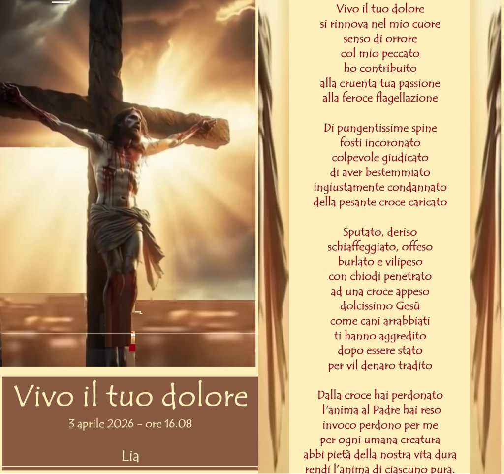 Vivo il tuo dolore Pubblicato daliacardinale3 aprile 2026Pubblicato in: Senza categoria Condividi: Condividi su X (Si apre in una nuova finestra) X Condividi su Facebook (Si apre in una nuova finestra) Facebook Mi piace Caricamento... Correlati