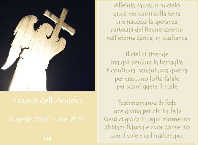 Lunedì dell’Angelo Pubblicato daliacardinale6 aprile 2026Pubblicato in: Senza categoria Condividi: Condividi su X (Si apre in una nuova finestra) X Condividi su Facebook (Si apre in una nuova finestra) Facebook Mi piace Caricamento... Correlati
