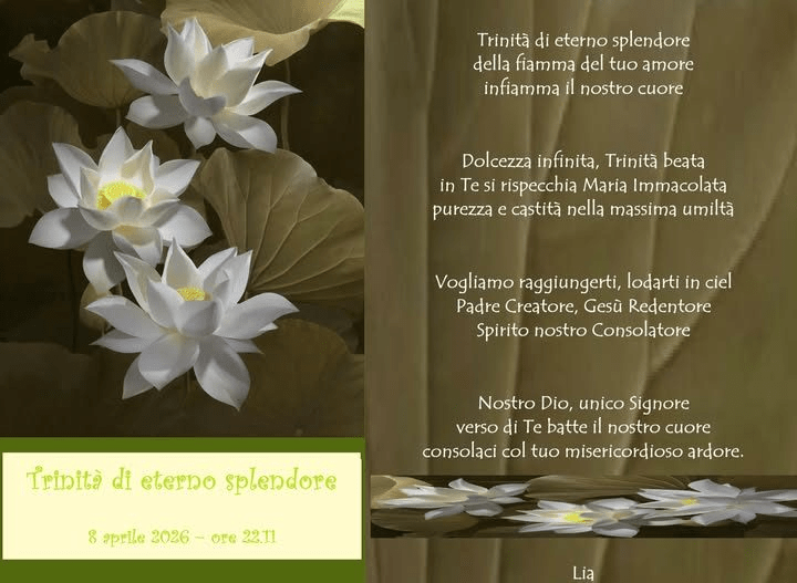 Trinità di eterno splendore Pubblicato daliacardinale8 aprile 2026Pubblicato in: Senza categoria Condividi: Condividi su X (Si apre in una nuova finestra) X Condividi su Facebook (Si apre in una nuova finestra) Facebook Mi piace Caricamento... Correlati